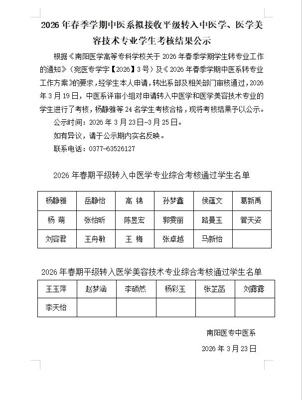 2026年春季学期中医系拟接收平级转入中医学、医学美 容技术专业学生考核结果公示